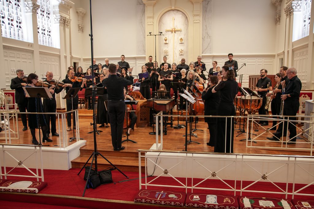 My thoughts were full of those recent viral videos as I went into the ABO’s April 18 performance of Ascension Oratorio, a program first played April 17 at Glenn Memorial Church with a third and final performance to follow on April 19 at Lutheran Church of the Ascension in Savannah. Those videos showcase the uncanny sonic realm that emerges when harpsichords, clavichords, and the like are played without the appropriate acoustic accommodations: chords sound brash and smushed together, melodic notes are tinny and tedious, and the whole experience feels like only a jumbled echo of the transcendent glory we normally associate with Bach.