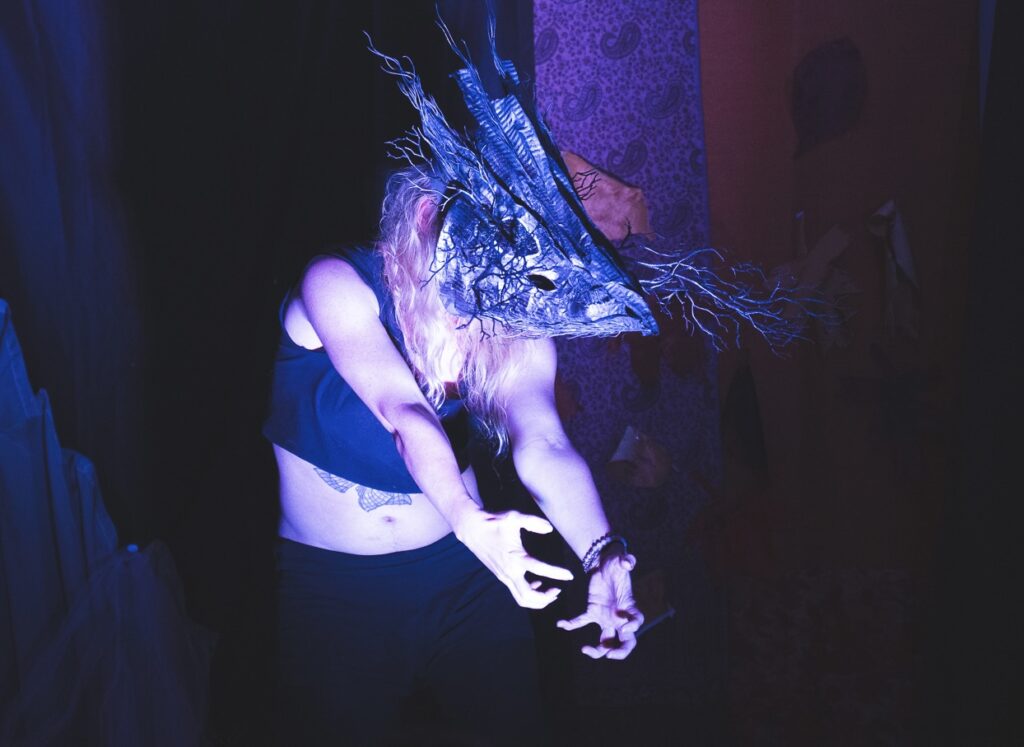 These masks, with their uncanny ghoulishness, gave the music, story and interpretive dance that surrounded them a centerpiece to build around. The characters — wild animals and assorted mystical beings — drifted in and out of the shadows in unsettling constructs that called to mind the nightmare realms of David Lynch and Lars Von Trier.