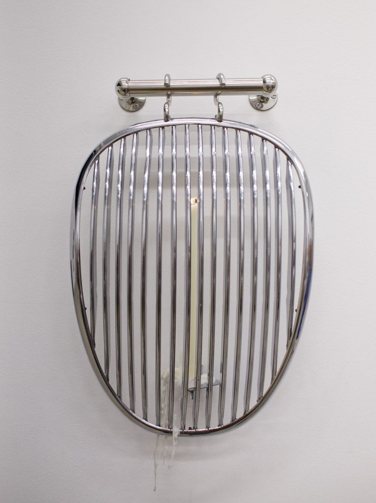 A second Hinks piece, Still a Tender Age, elevates a chrome grill into a shrine for his mother with the addition of a single candle. Hinks acquired the vintage car part while relocating his father to a home previously owned by a Jaguar enthusiast. “With something that beautiful, the hard work is done by itself. It’s just finding a way to delicately and elegantly install it.”