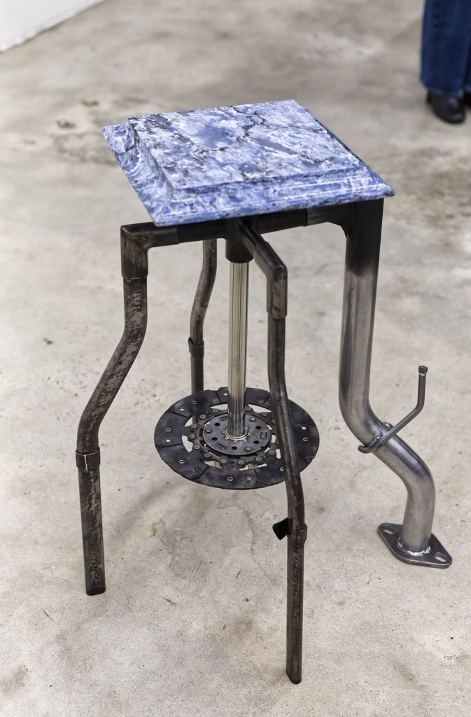 On his final trip home to stay with his mother, Hinks’ Peugeot broke down, requiring a pricey tow trip and repair. Hinks demanded the garage give him the faulty clutch so he could incorporate it into his work, a small side table titled Waiting Room. “It cost me such a huge amount of money I was like, ‘I need to use it, because I still feel resentment for it.’”