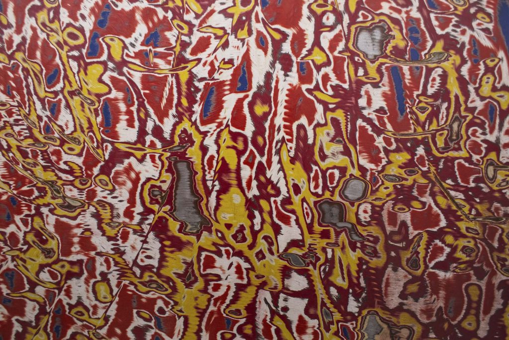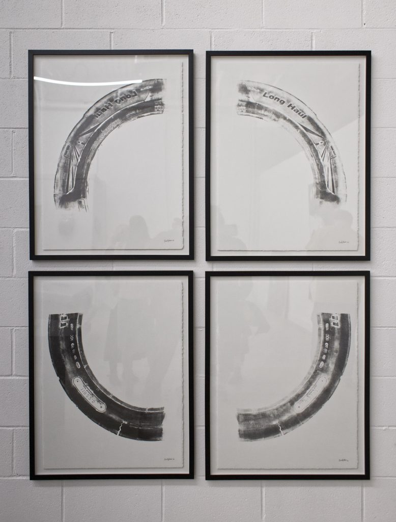 Emily Baker, an assistant professor of sculpture at Georgia State University, similarly repurposes found objects in her work. Sinews Underfoot is a series of four relief prints taken directly from a long haul truck tire she found on the side of the highway. The illustrated rubber sidewall, once used as the base of a road construction pylon, handily fit in the bed of Baker’s Toyota Tacoma. “I’m schlepping work all the time, so it’s nice to have a vehicle that I can load a bunch of stuff.”