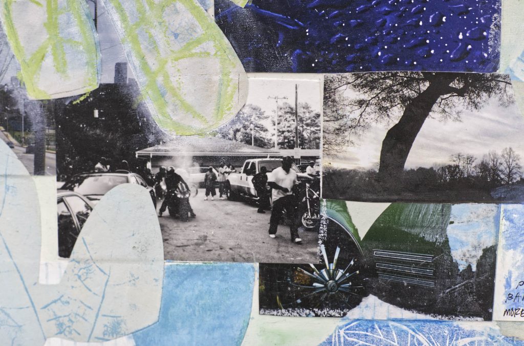 To multidisciplinary artist Artemus Jenkins, cars are simply a tool for getting around town. Jenkins owns a pragmatic Ford Focus, but he admires other Atlantans’ automotive passions from a documentarian perspective. His mixed media collage, Simpson Rd., combines nature imagery with photographs from car shows and Ben Hill Day, a neighborhood celebration, where a motorcyclist is captured doing a burnout.