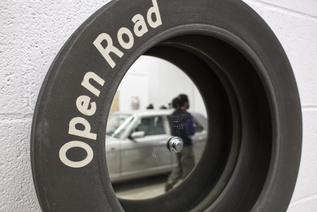 Renovations complete, Construct’s current exhibit adopts motor vehicles as its central focus. Next Exit, a group show comprising works from 11 artists — plus an actual Bentley — explores the emotional and practical function vehicles play in people’s lives. Mediums range from acrylic paintings to found objects to intricate porcelain casts — every piece reflecting the maker’s unique relationship to America’s dominant form of transportation.