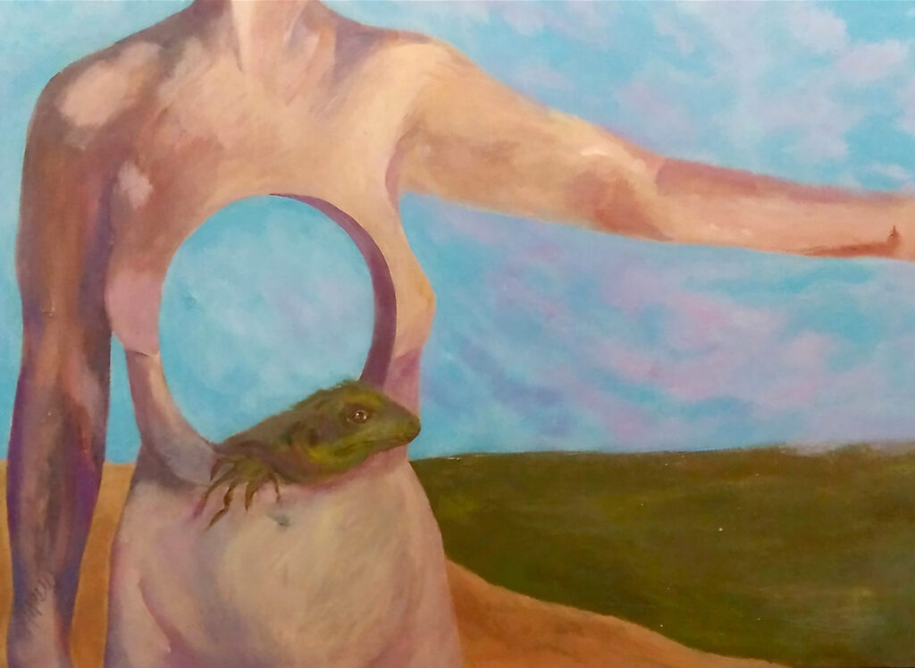 In the brochure, visitors are told first that this exhibition “seeks to showcase contemporary artworks that serve as an exploration of dreams, the subconscious, automatism and the irrational — themes central to Surrealist ideology.” The next pages contain instructions on how to create an exquisite corpse collaborative artwork or piece of Surrealist poetry. Then comes an illuminating exhibition statement created by combining the curator’s musings with extracts from the artist statements of 11 of the exhibiting artists, woven together by the curator according to the Surrealist principle of “a release of conscious control.”