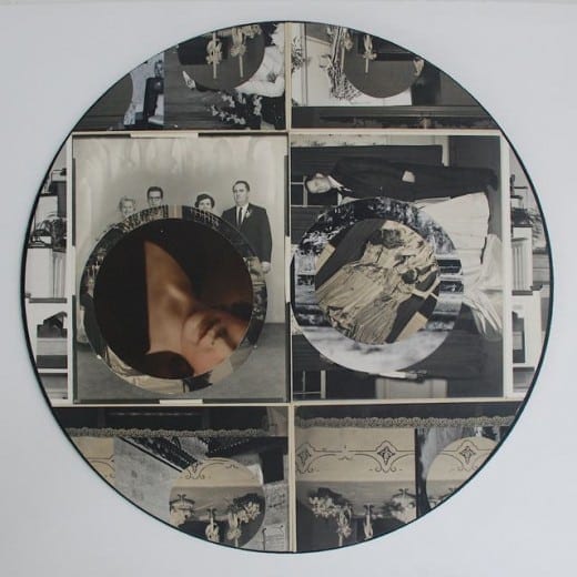 The reworking of the photographs into arcs, spheres and other curvilinear shapes lends them almost an architectural presence. The depth of space created in the negative areas gives them weight and presence. This is most successful in the largest piece, “The Inevitability of the Fading,” wherein the theme of marriage is continued. Here, the juxtaposition of a color portrait of a young woman with the black-and-white wedding party scenes reinforces the sentiment of its title. And who among us can resist the nostalgic pull of what once was and can never be again?