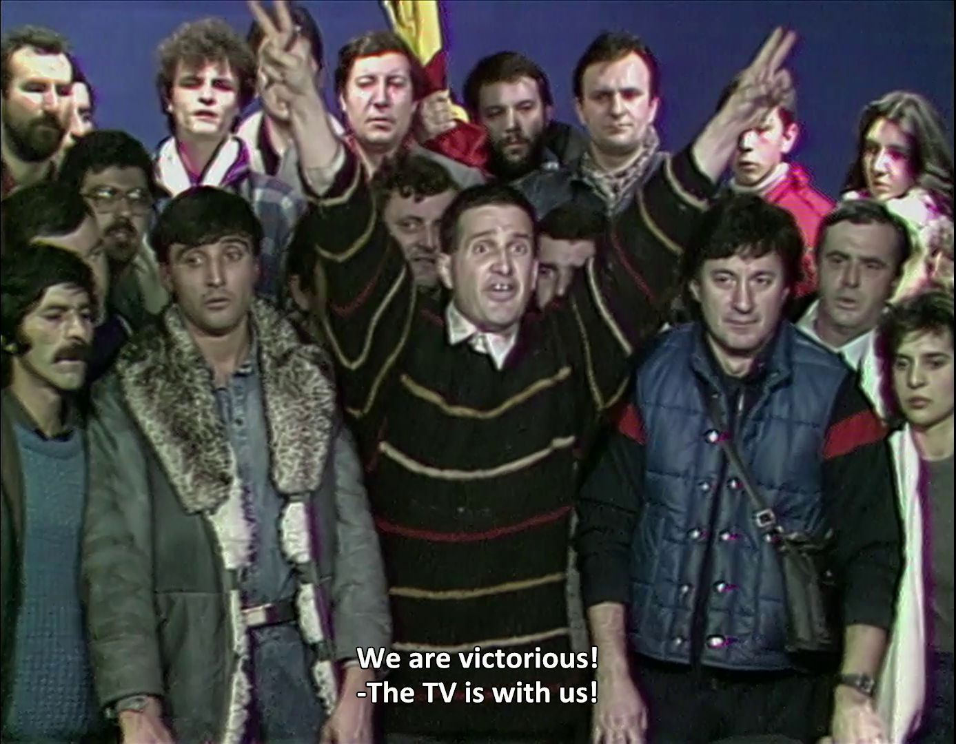 The editing of Videograms is a skillful dance between official state television footage, footage the official cameras recorded but did not broadcast, camcorder street imagery taken at great risk by citizens, video from inside people’s homes as they bear witness, and documentation of the chaotic atmosphere inside the television station where rebels have taken over and are under attack by forces loyal to Ceauşescu.