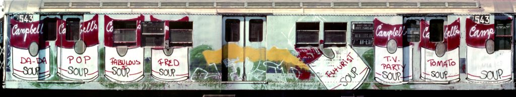 Brathwaite based his street moniker on an association with the Fabulous 5, a graffiti crew that specialized in painting entire sides of New York City subway cars. In 1980, inspired by Andy Warhol and pop art in general, Fab 5 Freddy caused a minor disturbance in the universe by painting a subway train car with huge cartoon likenesses of Campbell’s Soup cans. The art was quickly obliterated by the New York Transit Authority, but the impression boosted Fab 5’s status among denizens of the burgeoning street art subculture and attendant dance party scene.