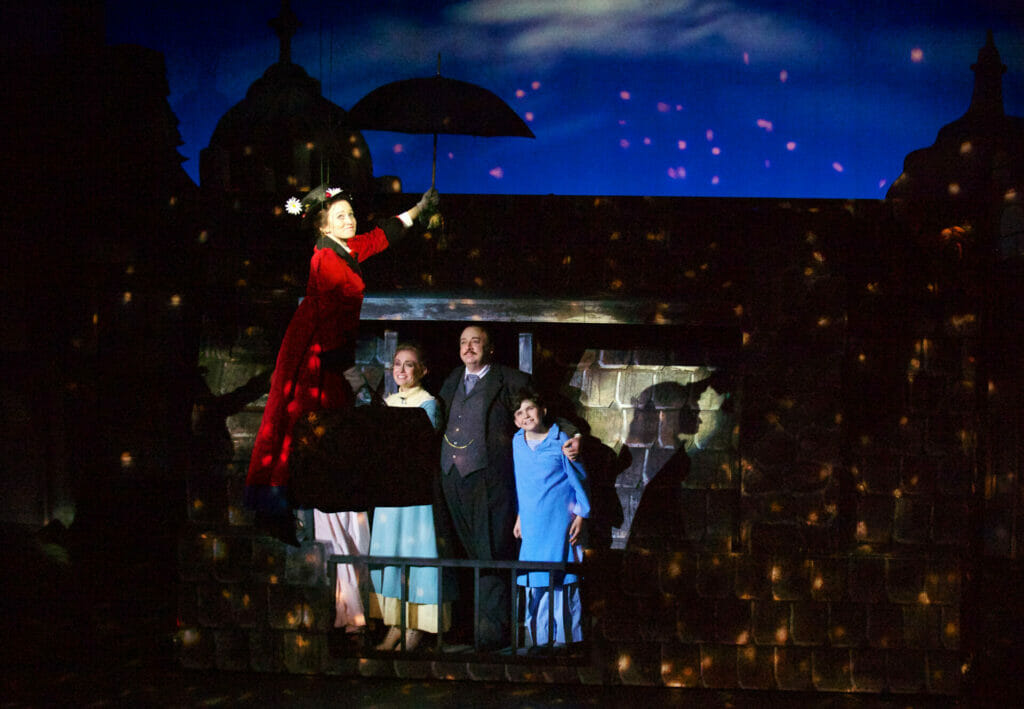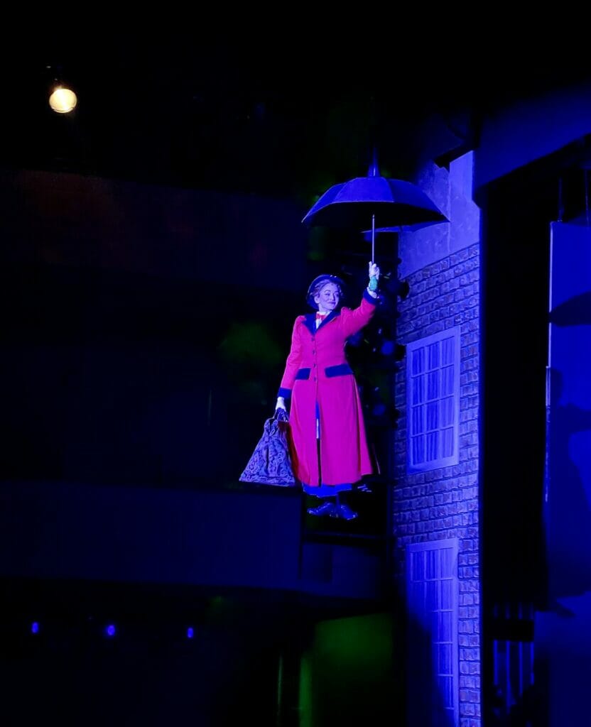 When Mary Poppins was on Broadway at the New Amsterdam Theatre, it was a high-flying extravaganza. The umbrella-toting title character went rising, rising, rising from the stage, drifting out over the audience until she was able to get eye-to-eye with ticketholders in the upper balcony. In 2006, the Washington Post reviewer called Mary-taking-wing “the most bewitching thing to hover over a Broadway audience in years.”