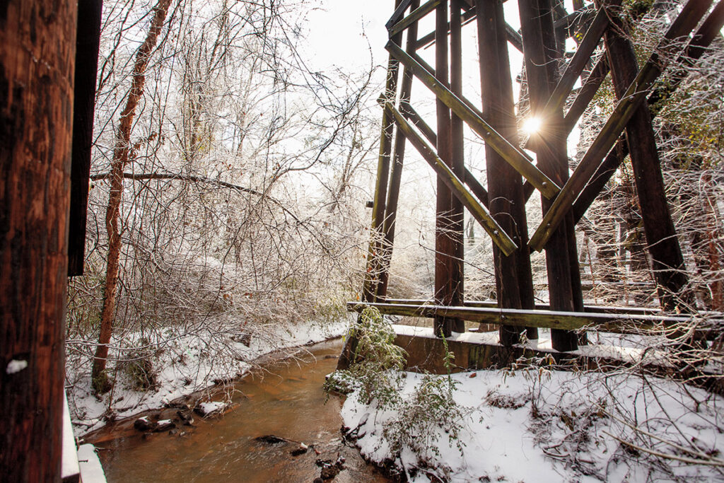 Another such shot, taken in a rare Georgia snowfall, puts viewers in mind of Emily Dickinson’s “certain slant of light.” Beams of a heavenly host, perhaps, or simply the power of nature — either way, Thrasher’s angles and lighting inspire a sense of reverence for the land and the trestle that was integrated within.