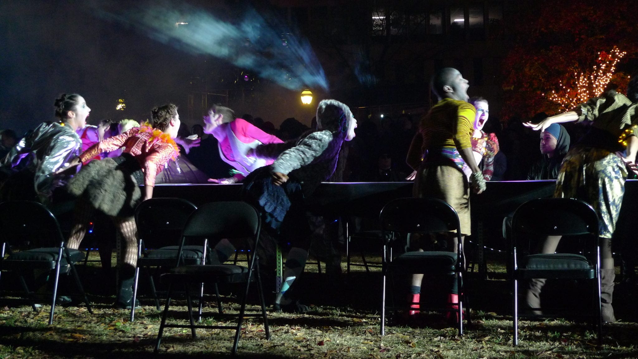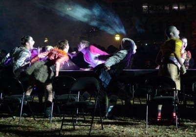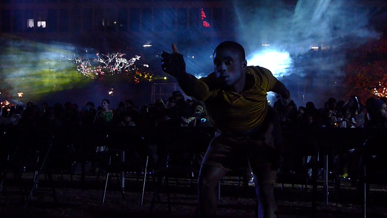 It leads to a philosophical dissonance where the raw, in-the-street approach is blurred by the crowd’s anxiety about actually seeing the event. At “Hinterland,” the dancers arrived unannounced and started weaving through the thick crowds. One sequence of dance was under an illuminated tree and culminated with … a crucifixion. Of the thousands in the park that evening, how many saw this? Perhaps it’s Stallings’ alchemic aesthetic strategy: you build up a mild anxiety because you’re missing something important, which is magically transformed into euphoria the moment you finally catch up with the action. (Photos in this gallery were provided by an anonymous photographer for use by ArtsCriticATL.)