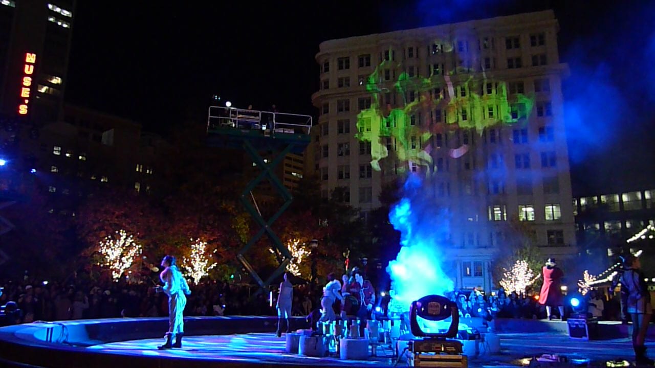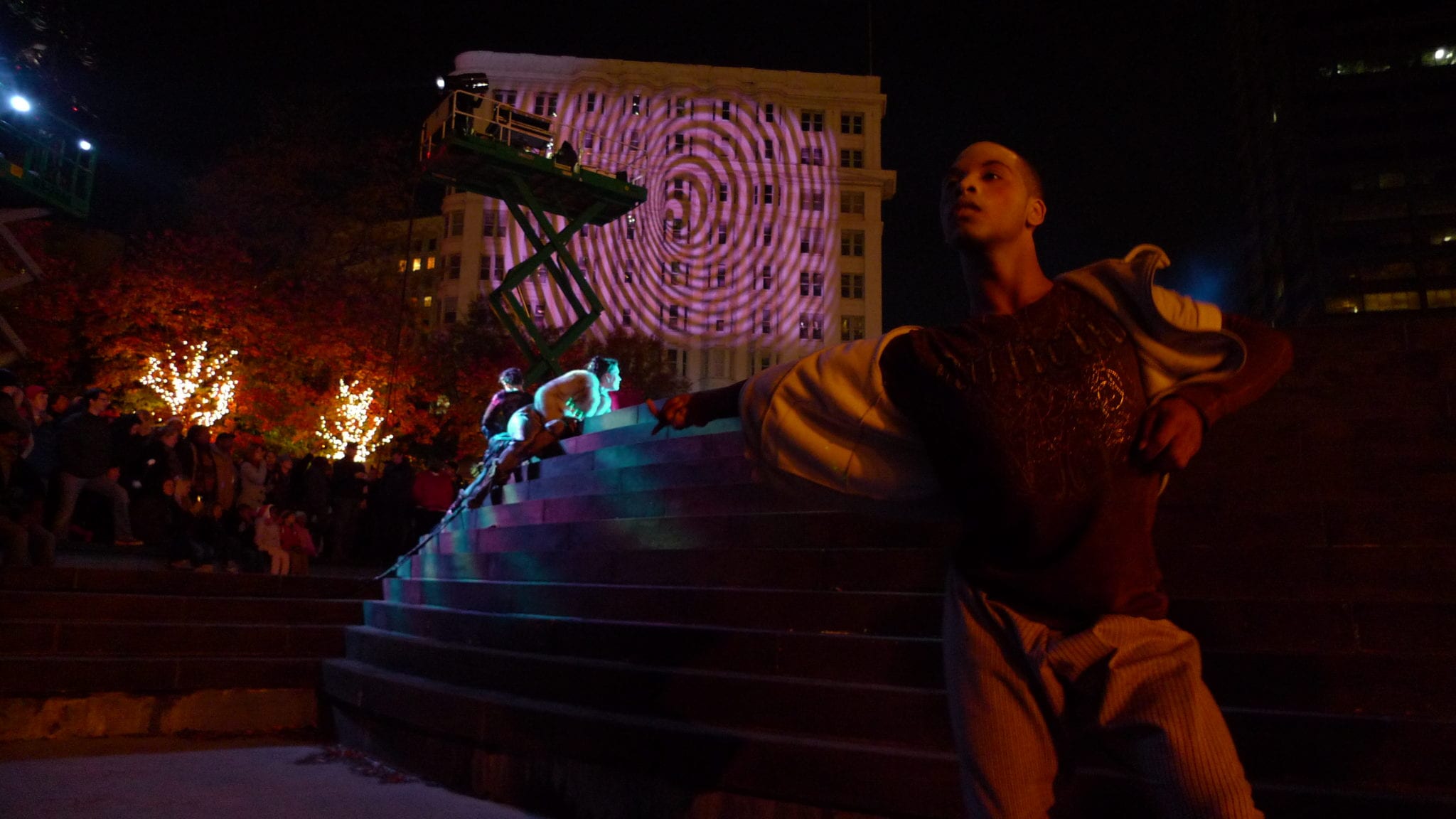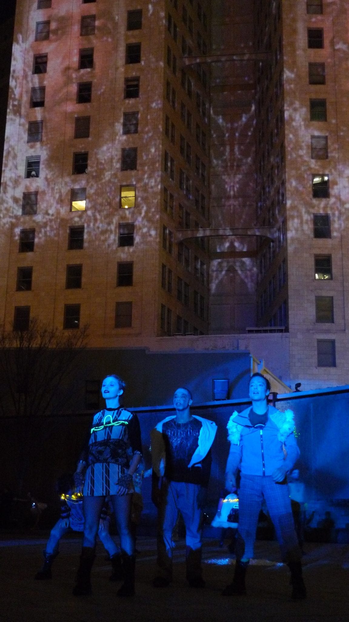 The “Hinterland” grand finale, in the following photos, turned the park’s water wall fountain into a stage of sorts. (Mercifully, in 40-degree weather, the water had been drained.) It was one of the few places where everyone could see what was happening.