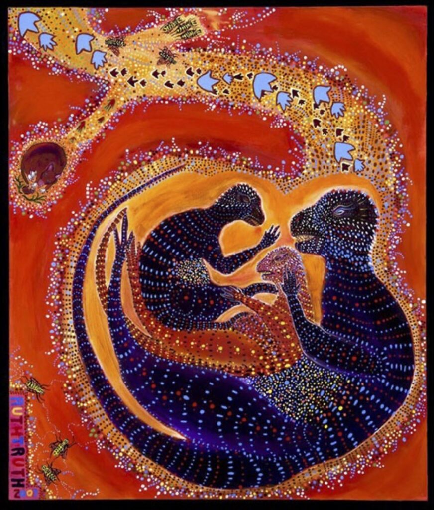 Schowalter: I was honored that my painting, Mother Earth, Mother Dinosaur, was the first piece displayed in the Selections art exhibit at Fernbank Museum of Natural History in 2011. Although I painted this work, I consider it one of our best collaborations. The image depicts an adult dinosaur with two juveniles in a burrow from about 95 million years ago. Tony’s research in 2007 on the first known burrowing dinosaur, Oryctodromeus from Montana, demonstrated that dinosaurs didn’t just lay eggs and abandon the nests but stayed around to do some parenting.