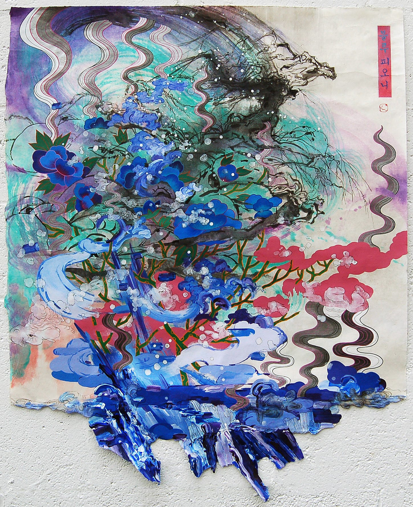 Moon is a crackerjack painter, as these works on paper affirm. Like many immigrants, she makes art about the cultural fusion of homeland and adopted country. She is rare among them in that her tone and outlook are upbeat. Rather than stress dislocation and outsiderness, her paintings say, bring it on. Moon melds references to Roy Lichtenstein, Asian scrolls, Korean pop culture and Abstract Expressionism just as deftly as she segues from translucent inks to opaque impasto acrylic.