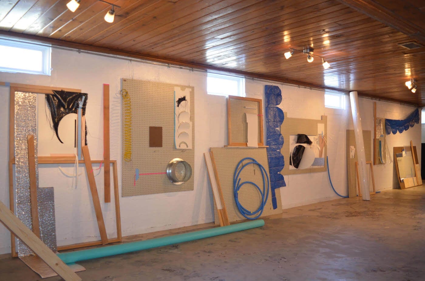 Krista Clark’s 40-foot installation titled The Division and Hierarchy of the Unintentional Sacred Space engages with the subject’s mundane form and recessive quality. On first glance, the installation looks like a spontaneous arrangement of materials from the hardware store — wood, pegboard, paper, sheet metal duct, tape and tarp. Closer inspection gives way to the feeling of precise vignettes with grouping and repetition. Clark, whose work typically manifests as clean architectural abstract drawings on paper, translates her spare geometric sensibility perfectly in her installation. The tension between random and deliberate is satisfyingly balanced.