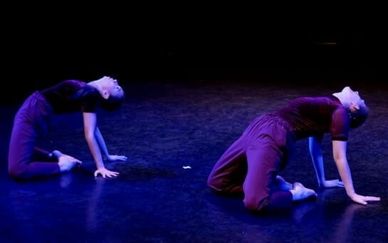 It was hard to believe that Medina’s two dances were choreographed by the same person. Ridge (2021), co-created with Jasmine Jawato, is a dynamic, abstract duet, opening with the breath and comprising tightly organized and repeated movement phrases: rapid, propulsive arm swings, bent knee dips with the torso rounded in contraction, panther-like crawls across the space and double rolls along the floor.