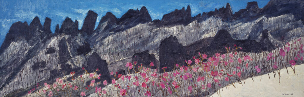 Kim’s winter paintings, according to wall text, “embrace the philosophical potential of nature’s vitality in all things . . . (its) hidden promise.” Mount Seorak dominates many of these paintings.