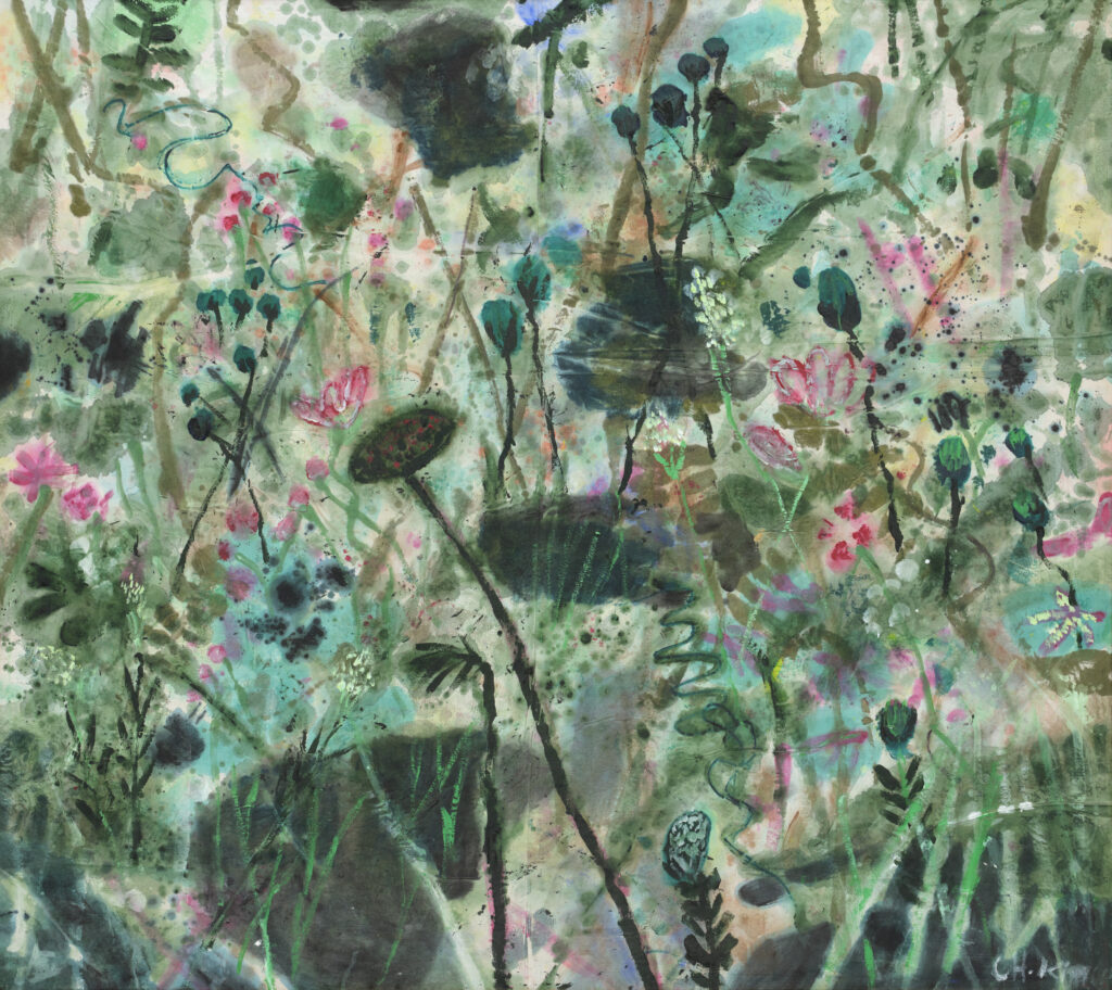 Moving upstairs into the exuberance of Kim’s summer and spring paintings becomes a literal experience of the changing seasons. Joyous and fecund, spring’s bright flowers and summer’s lush greens make for riotous paintings, especially so when seen beside Kim’s quieter practice of daily botanical studies drawn from nature.