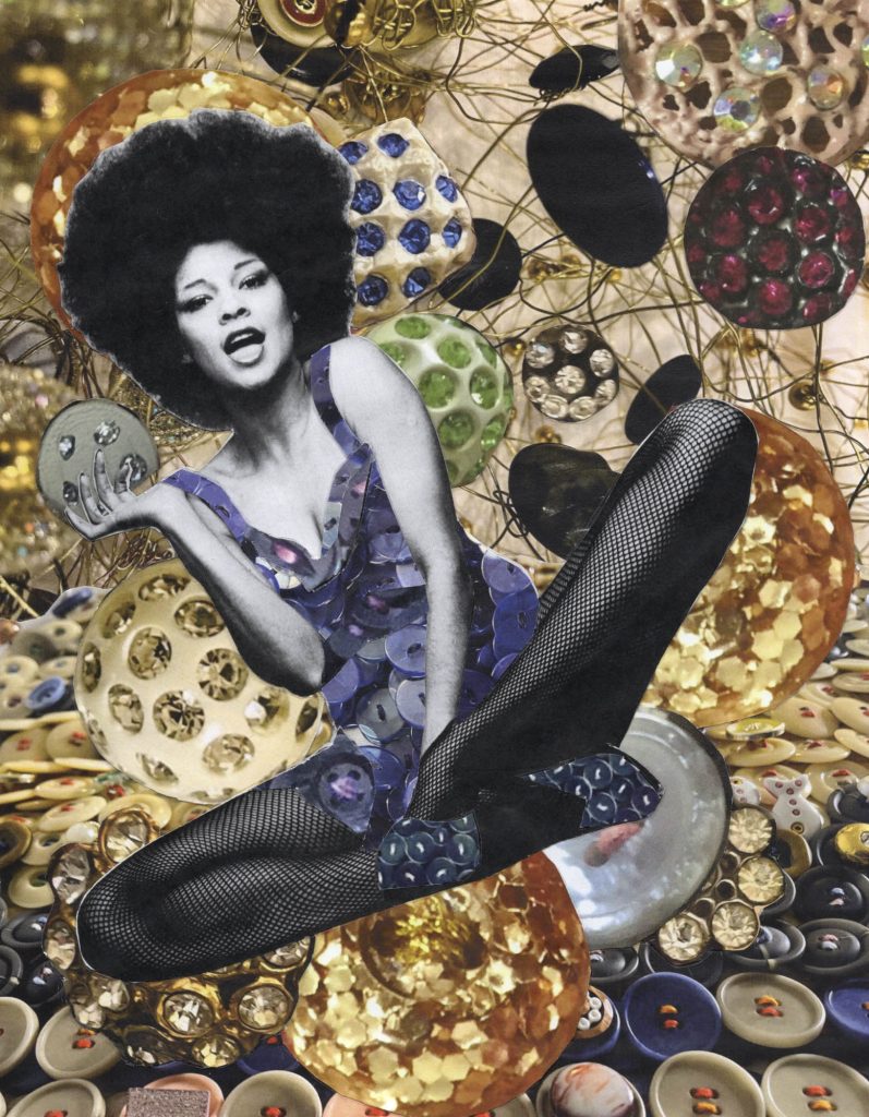 McCall’s exhibition fills three main rooms downstairs and continues upstairs, where memories of friends who have transitioned stand beside images of musical icons. In one piece from the Diva Worship series, Donna Summer appears crowned in voluminous curls, her face framed by gold rhinestones, neutral buttons, a shimmering disco ball and gorgeously gaudy 1970s splendor.