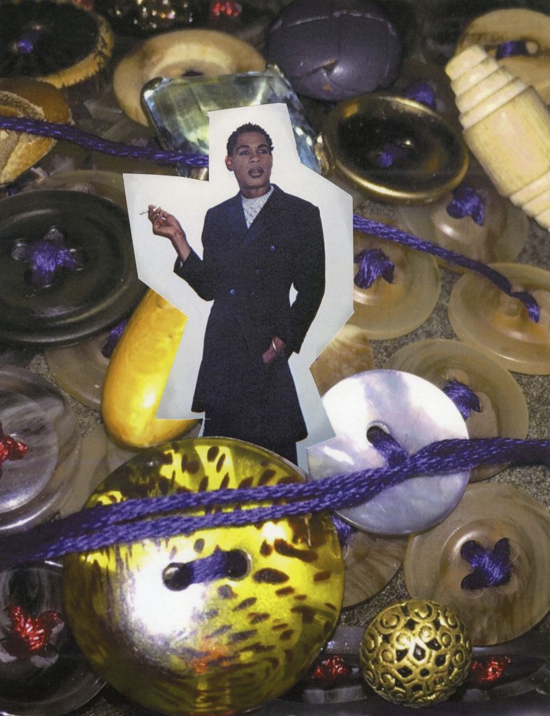 Buttons hold things together. They sit over the heart, travel the spine, close gaps between fabric and flesh. In McCall’s hands, they become witnesses. Collages merge photographs with buttons, beads, cassette tapes, handwritten playlists, African masks and figurines. He builds textured altars to cultural memory. Portraits honor iconic figures such as Patti Labelle, Diana Ross, Donna Summer, Betty Davis and others — stars who taught Black people and the LGBTQIA+ community how to be both seen and felt.