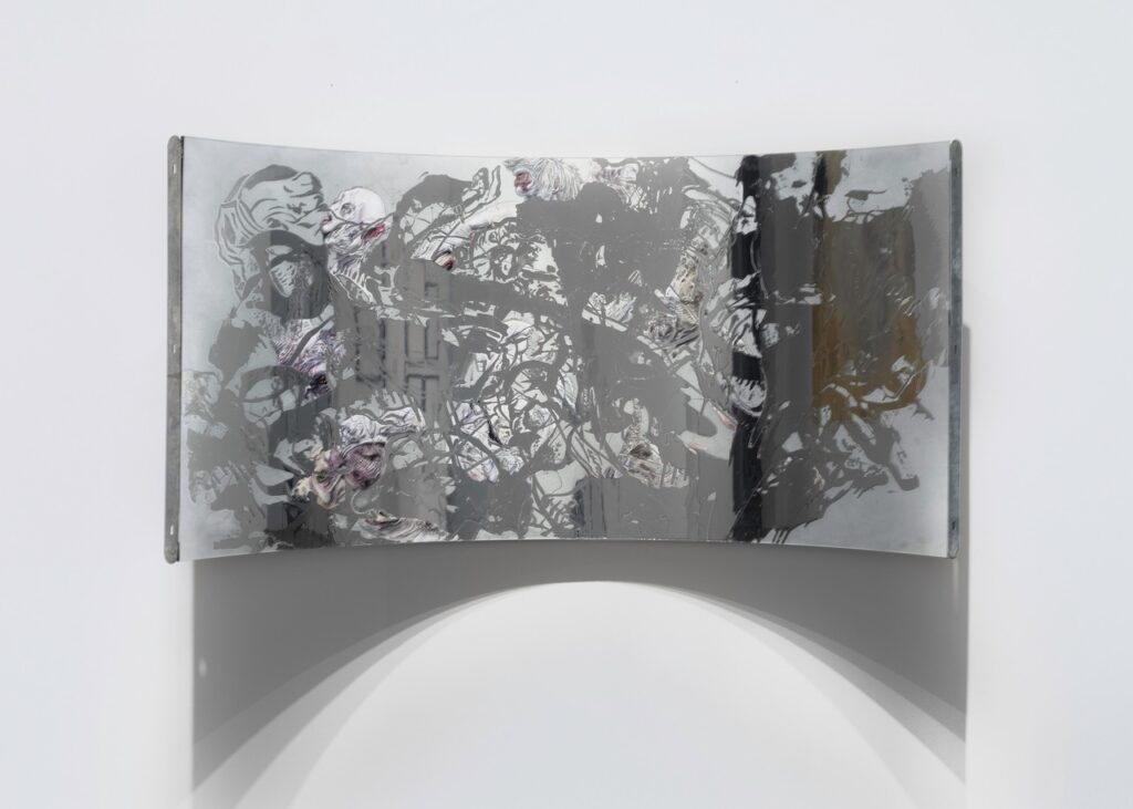 Jimmy O’Neal’s solo exhibition, Spittin’ Image, which continues at the Johnson Lowe gallery through April 19, takes its name from the idiom “spitting image,” implying an exact likeness or replication of a thing. O’Neal uses this idiom to reference AI and other generative algorithms, which the artist has been using to create his artworks for almost 20 years. Feeding images of himself and text prompts into these algorithms, O’Neal creates sets of abstract imagery which are superimposed to create the visual structure of each artwork. These nearly unrecognizable meshes of the artist and computer-created images are painted with gray, white and colorless acrylics atop a mirrored panel.