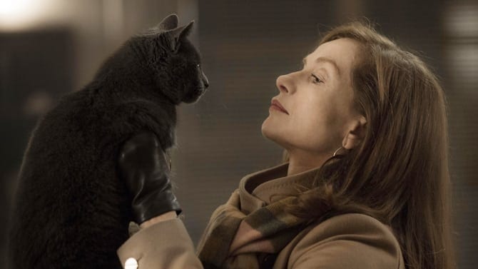 We don’t meet any of these people for a while in Elle. The first character we see isn’t even human. That’s a cat, watching passively as its owner, Michèle, is brutally raped on the floor of her house by a man wearing a black mask.