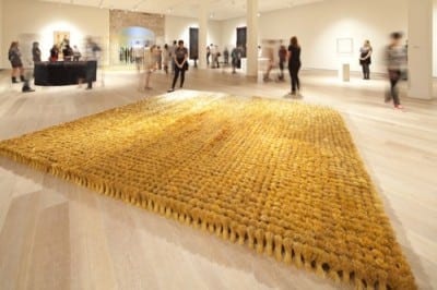The fourth gallery (above) is exquisitely installed with a well-curated exhibition by artist Liza Lou. For more than 15 years, Lou has transformed everyday objects into bead-encrusted delights. While the show primarily focuses on her new minimalistic sculptures created in 2010-11, it intelligently weaves in some wall-hung prayer rugs from 2007-08 and the large-scale installation “Trailer” (1998-2000), which sits in the nearby courtyard and lends some historical perspective.