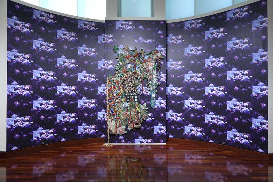 Ebony G. Patterson’s The Dream bursts with wonder. The bricolage work assembles strings of pearls, jewelry, tassels, mosaic patterns and thick, luxurious fabrics into statements about human nature, with hints of the human form, like a single hand or a swaying body, hidden throughout. Its beaded and sequined foreground revels in femininity and adornment, dancing on the tranquil field of flowers papered on the wall. But closer looks reveal a contrast of beauty with something ominous and unsettling underneath.