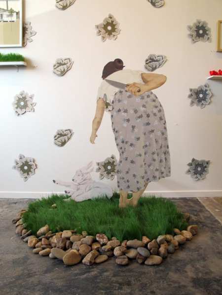 English presents the more polished, coherent body of work. Based on a trip back to the old homestead, her work evokes the decaying buildings, the lush green canopy over those red clay roads and her family stories. She brings in new materials — bright green wheatgrass “growing” at the bottom of each image and on the ground beneath the cutouts — and sound.