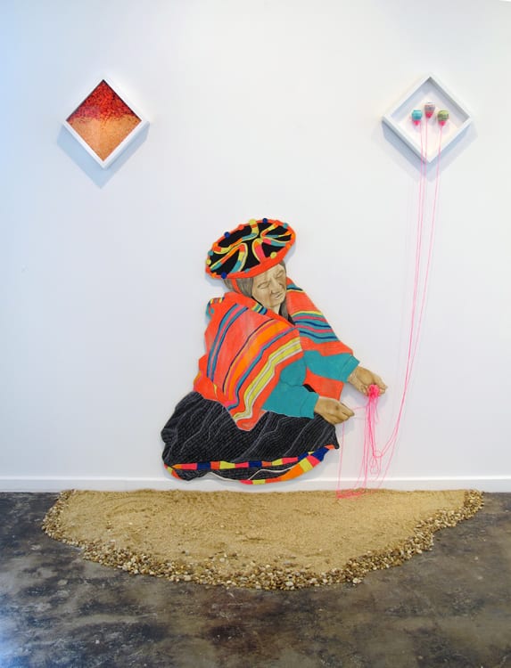 “La Mujer del Mercado” (below), her most successful work, is a cutout of a squatting Andean woman who holds the hot-pink string of an abstracted kite that floats above her. Nica has filled a diamond-shaped frame with dyed potatoes and quinoa. The use of these dietary staples has promise: their textures and symbolic importance could be exploited. But it’s not quite soup yet, if I can mangle metaphors. As with some of her other pieces, the scale of that element gives it a tentative look.