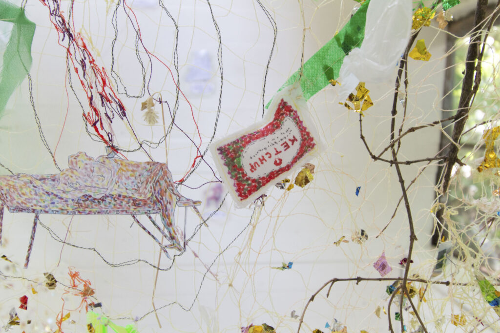 Although reaching across the expanse of the small gallery, this artwork is visually weightless. Featuring a litany of materials such as fabric, trash, sticks and inkjet prints, these items have been atomized. Sticks have become twigs; fabric has become scraps. Trash has become plastic confetti. This mélange hangs from hand-sewn netting with stitching so loose as to become a diaphanous gossamer.