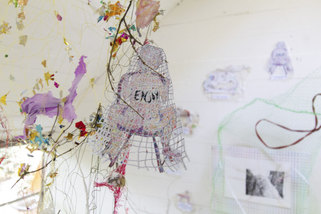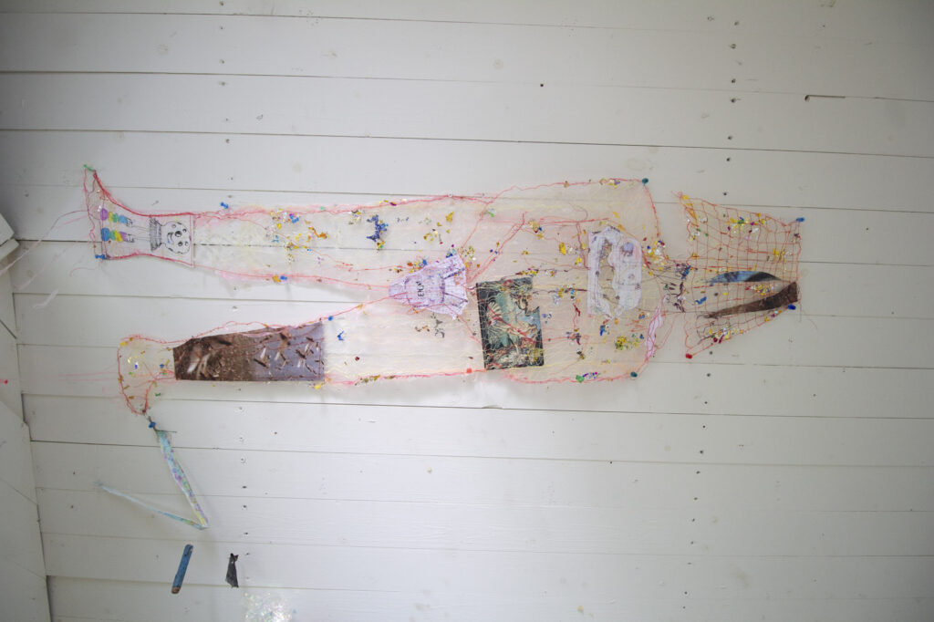 On the bench near the entrance, one small, scroll-like drawing articulates a two-dimensional rendition of the trash-filled net hanging nearby. Written underneath this languid mesh are the words “there is no death without openness.” The negative spaces of the netting have now gained double reading as memento moris: a literal representation of loss. A flood is a great release of energy, one which can lead to just as much loss as it does catharsis.