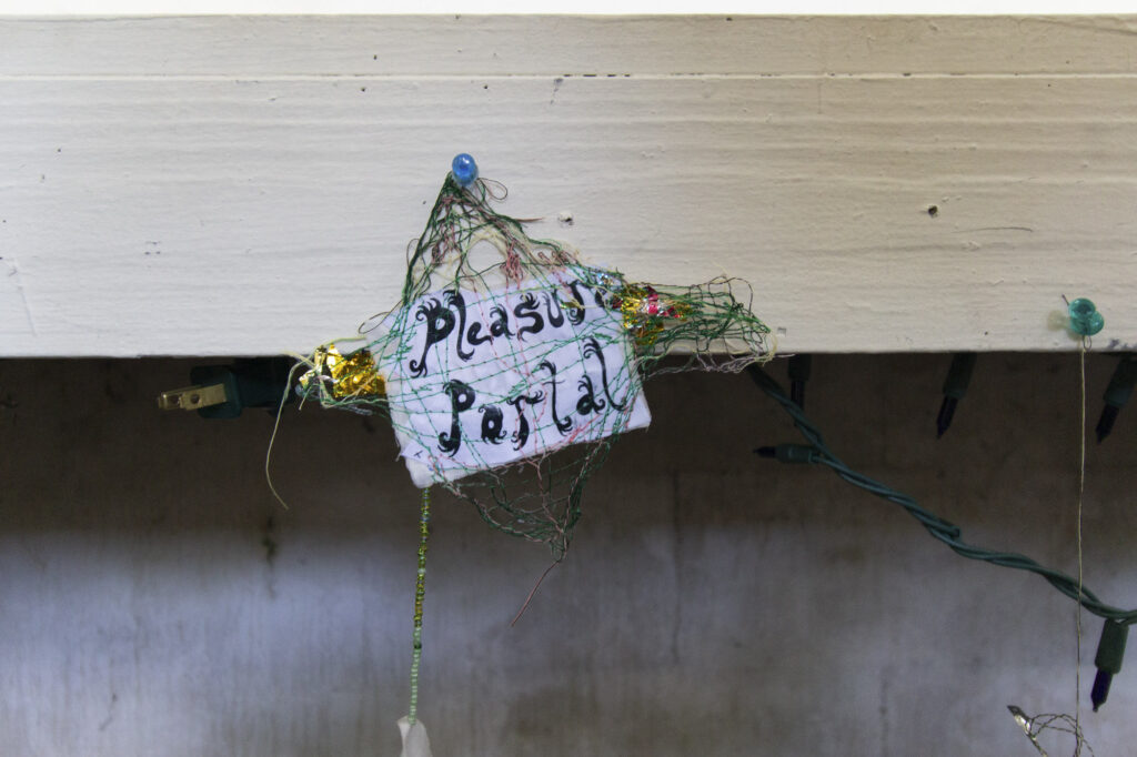 Stepping down into the gallery, it’s hard not to be overwhelmed. Incantational nectar: prism squeeze me, create structures for air — let me expand and contract in endless spirals (2025) is a large, webbed artwork that hangs from the ceiling. The piece droops down, connecting the floor, sidewalls and ceiling. Everything is interconnected, creating a banner which accurately describes both the physical makeup and emotional tenor of this exhibition.