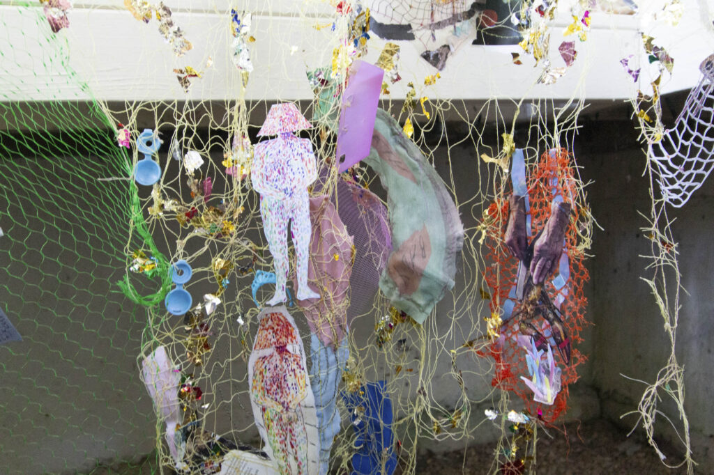 This lucent structure obliquely evokes the body, for what is netting without something to catch? Look closer and you will find them. Snagged in the net are several drawings of bodies, all sporting a lampshade in place of a head. Drawn with a pointillist technique — a fabulous replication of the trash-speckled net supporting the drawings — the simplified silhouettes are stippled with blues, oranges, purples and pinks. This largely analogous color scheme communicates warmth and energy.