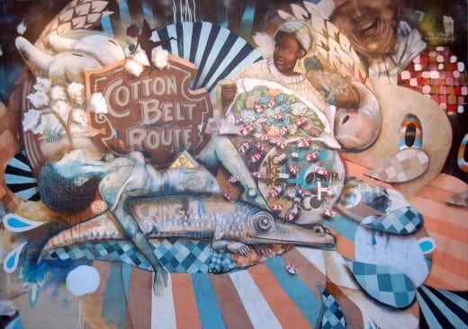 Likewise, it’s possible to extract a reasonably coherent allegory from a work such as “Cotton Belt Route,” in which a black maid dumps out a container of wrapped peppermint candies such as were found on the living room table of every Southern woman of a certain age, while other assorted markers of a bygone but recent South surround the vintage logo of the railroad’s “Cotton Belt Route.” But in such works as “Our Faithful Hooch II” the allegory scales off toward semi-intelligibility, as Scarlett O’Hara, looking askance at a crow (or is it a raven, or a blackbird?), dominates a painting in which other birds perch on telephone wires and a child swings unaware and unharmed from the branch of a tree that contains a large hornets’ nest. As in “Detritivores of a System,” where a bottom-feeding catfish overlays a riverboat, a mansion, random black faces and a complex polyhedron, each image taken individually suggests a symbolic or allegorical meaning. Taken together, though, the composition begins to resemble the logic of a dream rather than a straightforward allegory. (It would be a well-structured dream, however; Tindel and Michi pointed out in a gallery talk that they use such things as repeated groups of three or seven as devices to keep the paintings visually organized.)