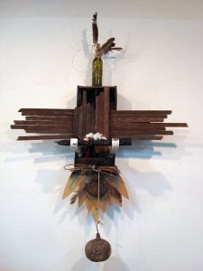 Perhaps “Baptism by Fire” could be read as a psychological portrait of Tindel and Michi as they come to terms with the South together and apart. “M. Dixon” is an impressive collaborative wall sculpture with imagery ranging from a black Union soldier to an apparently appropriated piece of signage reading “My Favorite Things,” with vines and cotton bolls in between, and time-worn fragments of architecture uniting the disparate visual elements. Despite its quintessentially Southern content, the work has a clear kinship with “The Bird Kachina” and “The Plow Kachina,” which derive their inspiration but not their appearance from the Navajo kachinas that Michi experienced in the desert Southwest.