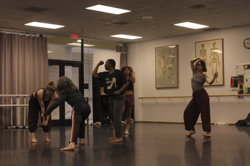 “So, for example, there’s a whole section of the piece that deals with stage directions, and the dancers are speaking these usually imperceptible words into the space. I’m curious about what that does.”
