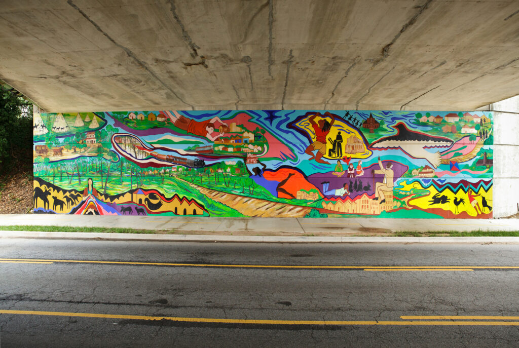 Although there wasn’t as much money in those days (“only one or two hundred dollars per project,” according to Poventud) there was an abundance of spirit and creativity that began to spread around the city. Those original projects included a massive maze made of old railroad ties created by award-winning multimedia artist Jeffrey Morrison, as well as the colorful and inclusive mural-history West End Remembers by renowned artist Malaika Favorite in 2010. That mural still stands today under the Lawton Street Bridge as the oldest piece of art on the Atlanta Beltline.