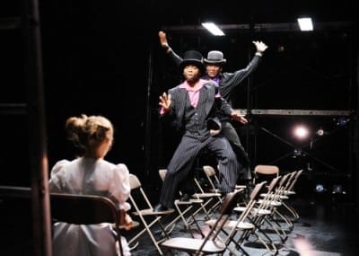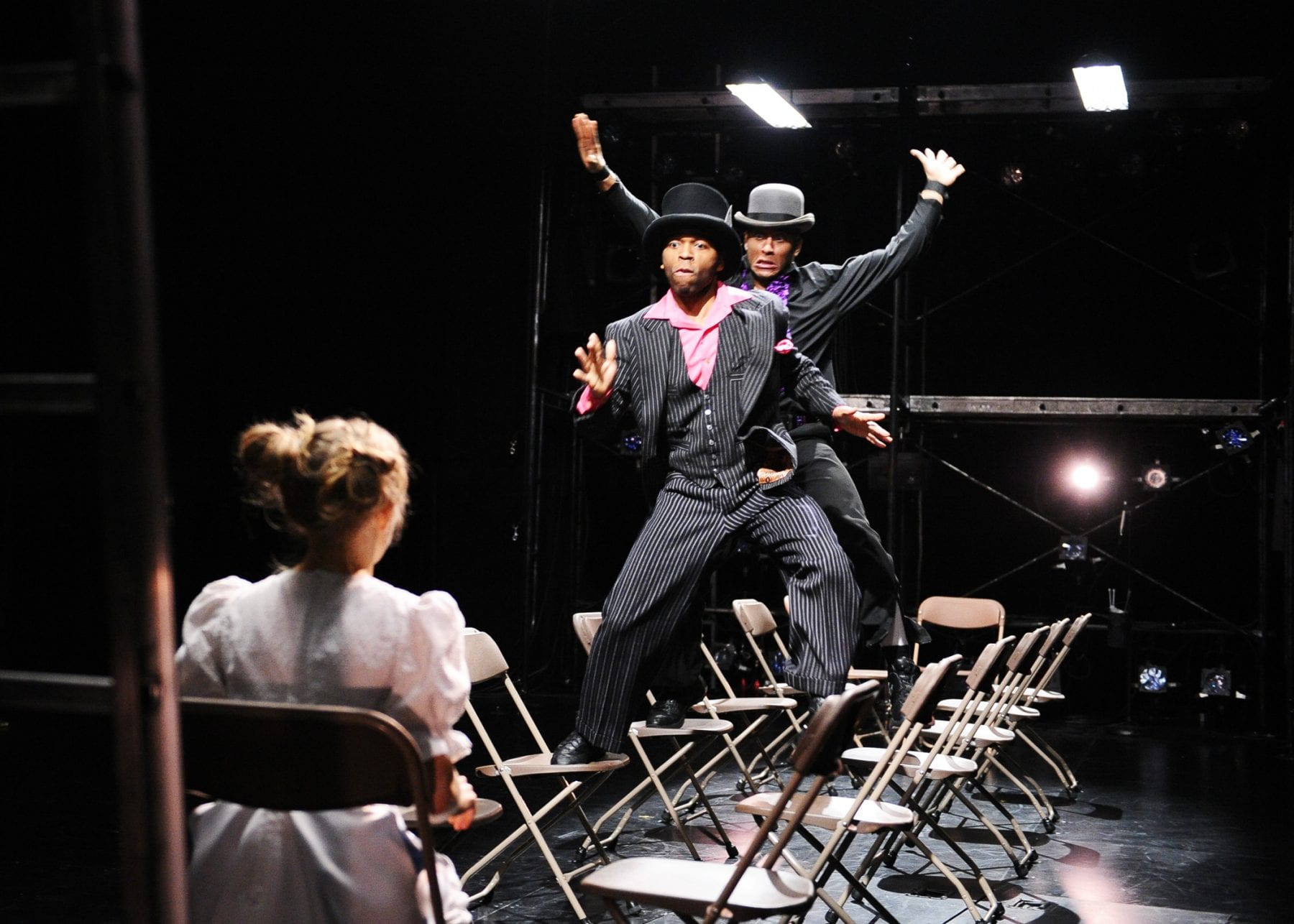 “Lookingglass Alice” was created by Chicago’s Lookingglass Theatre in 1988, the brainchild of David Catlin. His big idea was to fuse the physically demanding circus acrobatic moves and dream-like elements of Cirque du Soleil with good old-fashioned theater, in this case a Victorian story that is full of weirdness with clocks, chess and wordplay. So when Alice goes down the rabbit hole, she does so more literally than usual, shimmying through a hula hoop suspended above the stage. To make this work, the Alliance’s usual stage space has been transformed, studded with trap doors, sliced in half with trick special effects and then put back together.