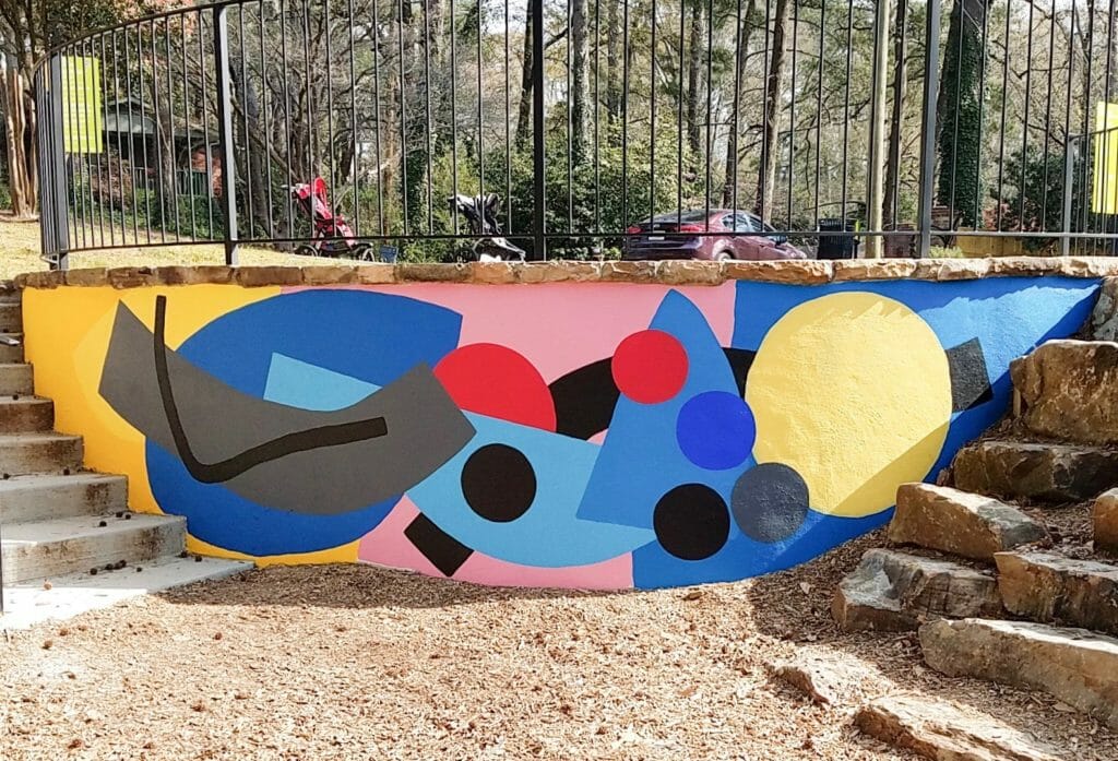 Many visitors to Armand Park might be completely oblivious to the fact that this happy little wall of brightly colored contours was painted by Alex Brewer, an award-winning, internationally acclaimed artist who has painted monumental, large-scale murals and total building facades in prestigious locations all over the world. The artist’s abstract style incorporates an array of shapes, forms, lines and colors to create a vibrantly dynamic shifting visual landscape across his building-sized canvases. Other local examples of Brewer’s work include the Westside Cultural Arts Center and the Virginia Avenue bridge on the Eastside BeltLine.