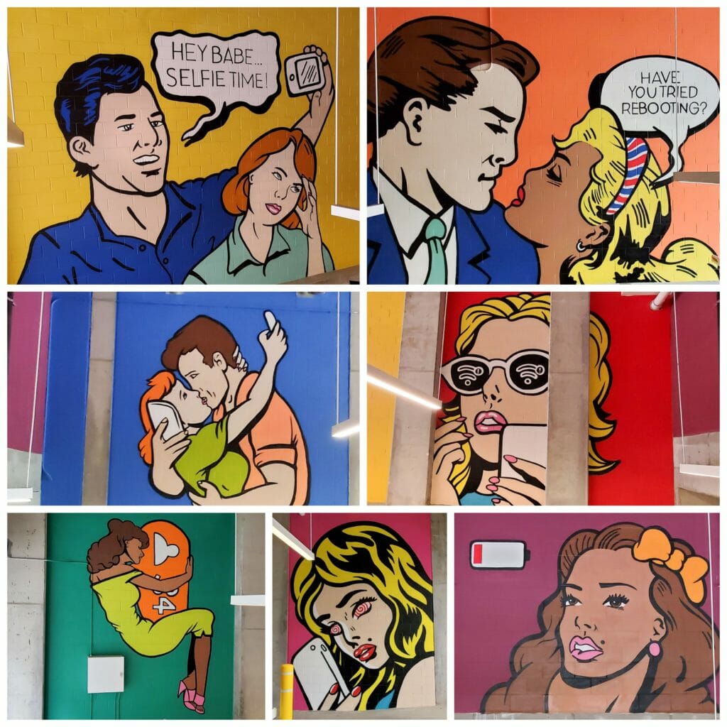 Typically, only those who park in the Modera Prominence retail parking garage would see these seven murals that parody our sometimes-dysfunctional relationship with technology. Veal is known for his use of humor and satire (sometimes subtle, sometimes not) in his murals, which often comment on various idiosyncrasies of our society and politics. For example, he once painted an image of Alfred Hitchcock on the BeltLine with the title “The Birds” as a spoof on the invasion of Bird scooters.