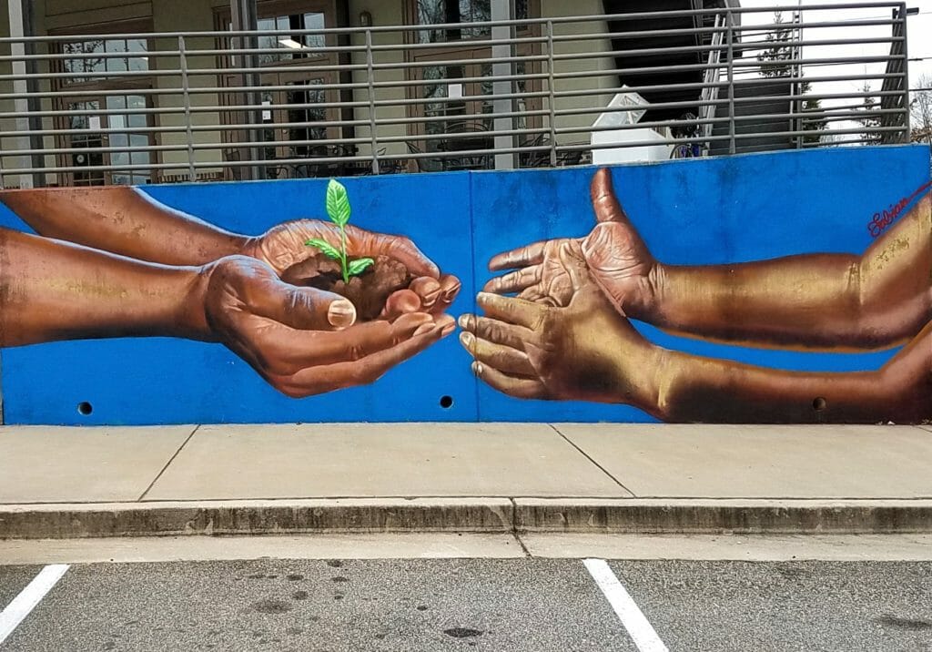 Fabian Williams is one of Atlanta’s best loved artists. In his role as an activist, he initiated the “Kaeperbowl,” where eight different artists painted murals of Colin Kaepernick for Atlanta’s Superbowl in 2019. Williams often portrays African American role models as larger-than-life superheroes in iridescent tones in prominent locations throughout town. However, this literally “down to earth” mural packed with generation-to-generation symbolism is tucked away behind the Jim Adams Farm & Table building for the enjoyment of those who seek it out.