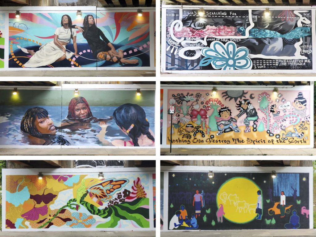 Curated by Drew Borders, the project features large-scale works by six women and nonbinary artists of diverse cultural backgrounds and experience levels: Danae Antoine, Vanna Black, Angela Bortone, Charity Hamidullah, Karaoke Rodriguez and Visakha Jane Phillips. “Since the project’s completion, we’ve already seen tangible shifts,” said Tatiana Bell, Living Walls’ creative director. “More pedestrian traffic, increased recognition of the area and meaningful exposure for the artists involved. Ideally, the underpass becomes not just a place you pass through but a space that offers pause, connection and affirmation.” Living Walls is upgrading the infrastructure of the underpass to include gutters diverting rain runoff from the mural to keep it vibrant for a long time to come.