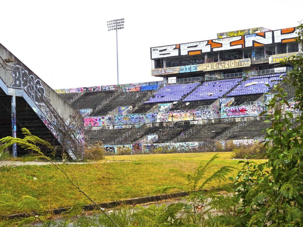 - Creepy or surreal locations that just don’t feel right, like a once familiar interior removed from its normal context, such as a dimly-lit deserted shopping mall after business hours where you can hear the echoes of your footsteps. Or perhaps an abandoned place like the eerily silent, graffiti-tagged college football stadium that now hosts roosting birds instead of fans.