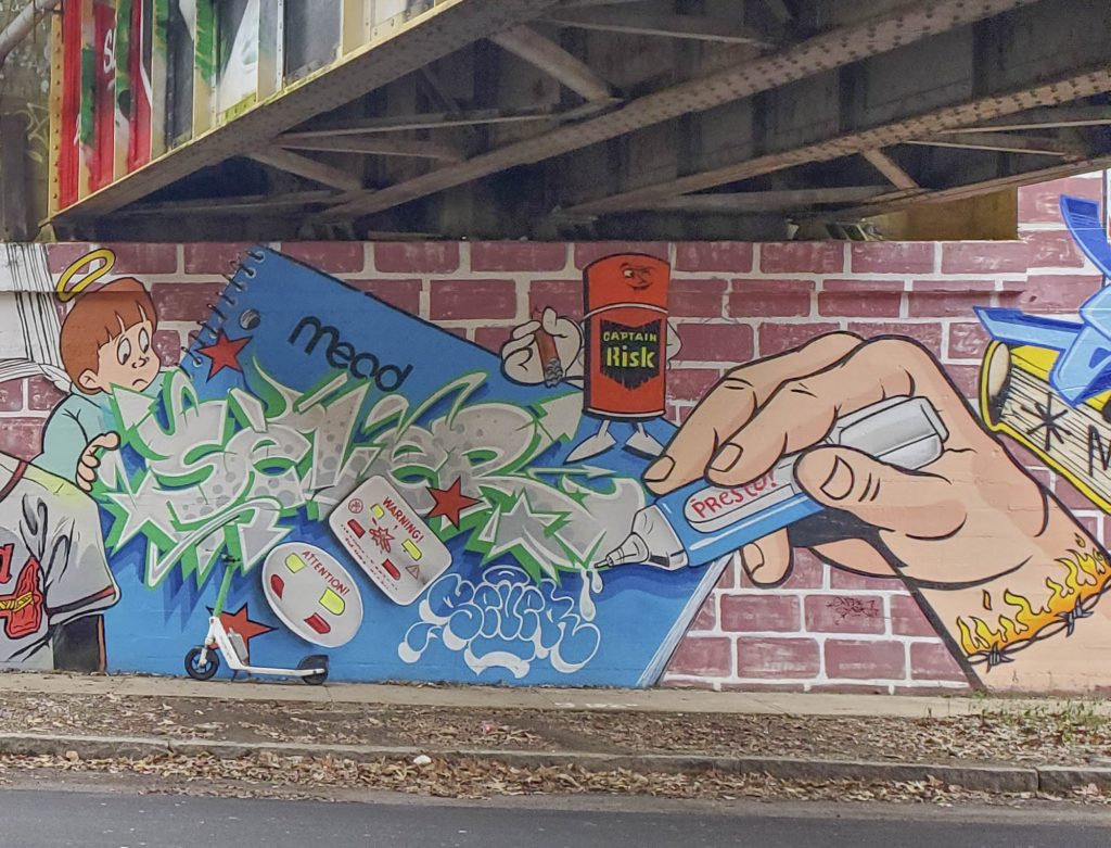 We typically travel straight through the liminal space of a roadway underpass without giving it a second thought. Here, you could easily find yourself delaying your Beltline stroll for a quarter hour spent uncovering hidden artistic gems. A couple of examples include the use of a street art sub-sub genre called brandalism in which “RISK” — the writer’s handle –replaces “RAID” on a 1970’s vintage can of insect spray. Because the colors and font are similar, the casual observer might not even notice. The Channel 2 Action News van is featured with the tagline “Coverage you can count on.” In this instance, the word “coverage” has the double meaning of news and paint coverage.