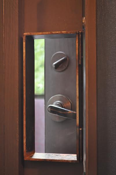 In the bathroom of the Tree House, Scogin and Elam wished for the large Corten door to swing outward onto the patio, allowing for a semi-outdoor shower experience. But, again, with bugs being a concern, an inward swinging screen door was also necessary. To allow for the main door to swing out, the architects had to design a small access door within the screen door to afford those inside the house the ability to open the exterior door without opening the screen door.